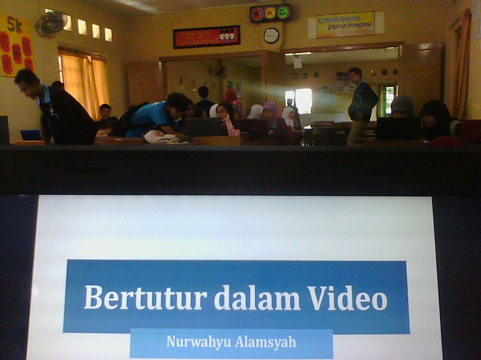 Aku putar beberapa video karyaku saat masih SMK. Tentu saja ini mengundang decak tawa bagi siswa-siswa yang hadir. Sedikit malu memang, tapi ini untuk merangsang mereka: bahwa membuat video editing itu tidak mudah. Perlu pengetahuan dan sedikit kreativitas. Setelah materi bertutur dalam video usai disampaikan, sekarang giliran belajar praktek.